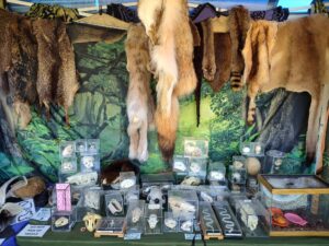 PELT ZOO / BONE ZONE: We have a collection of real animal fur scraps & pelts along with a collection of animal skulls. Hand the visitor a fur scrap/pelt and ask them to think of what animal they think it came from. Give them clues about the animal to help them. Each piece of fur has a letter code on the underside. There is a list which tells you what the animal is based on the code. We allow visitors to pet the furs with the back of their hands only, we do not allow fingers on the pelts to avoid oils being transferred which will ruin the pelts.